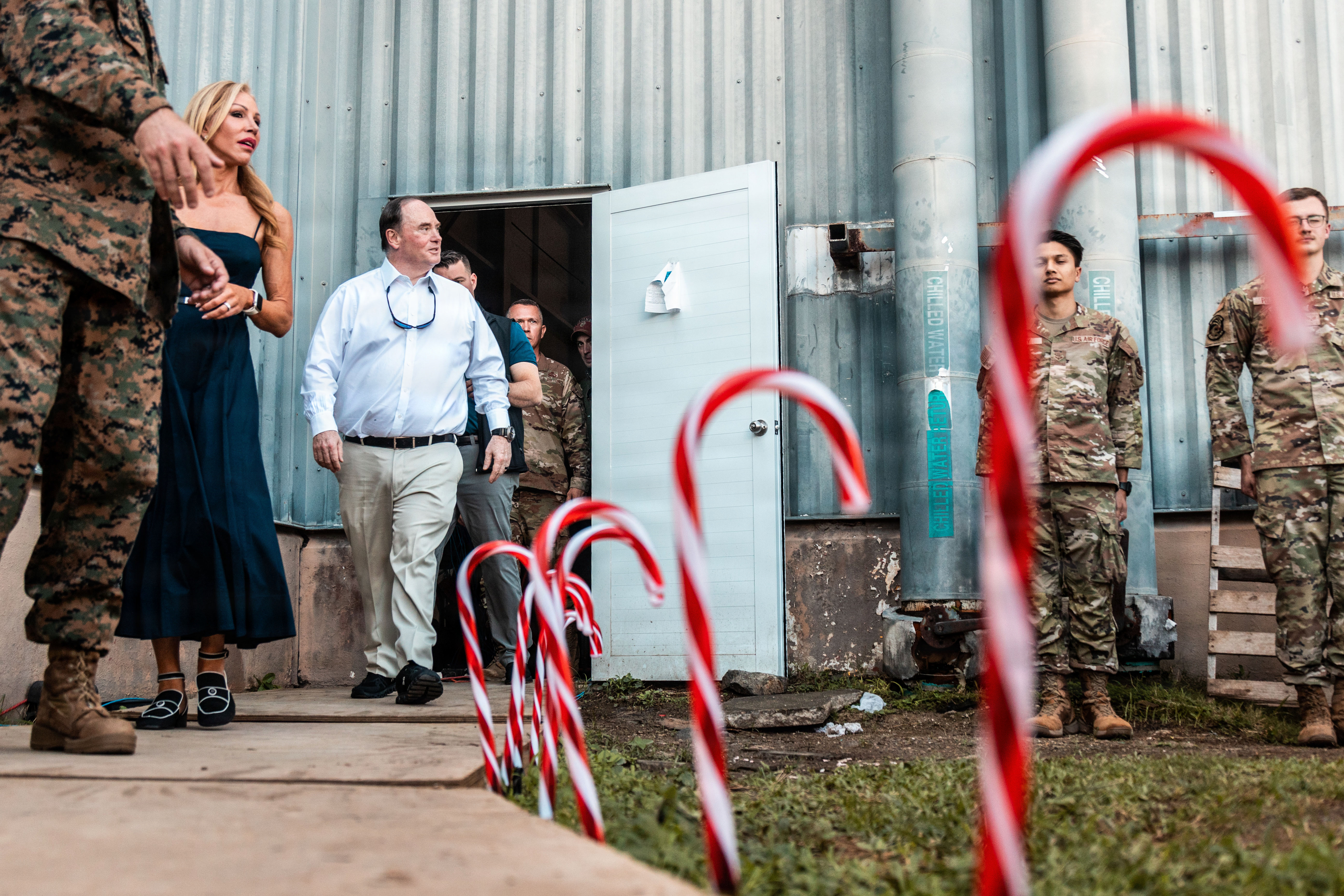 The Honorable John C. Phelan, secretary of the Navy, greets U.S. Airmen with the 5th Combat Communications Group at Jose Aponte de la Torre Airport in Ceiba, Puerto Rico, Dec. 24, 2025. U.S. military forces are deployed to the Caribbean in support of the U.S. Southern Command mission, Department of War-directed operations and the president’s priorities to disrupt illicit drug trafficking and protect the homeland. (U.S. Marine Corps photo)