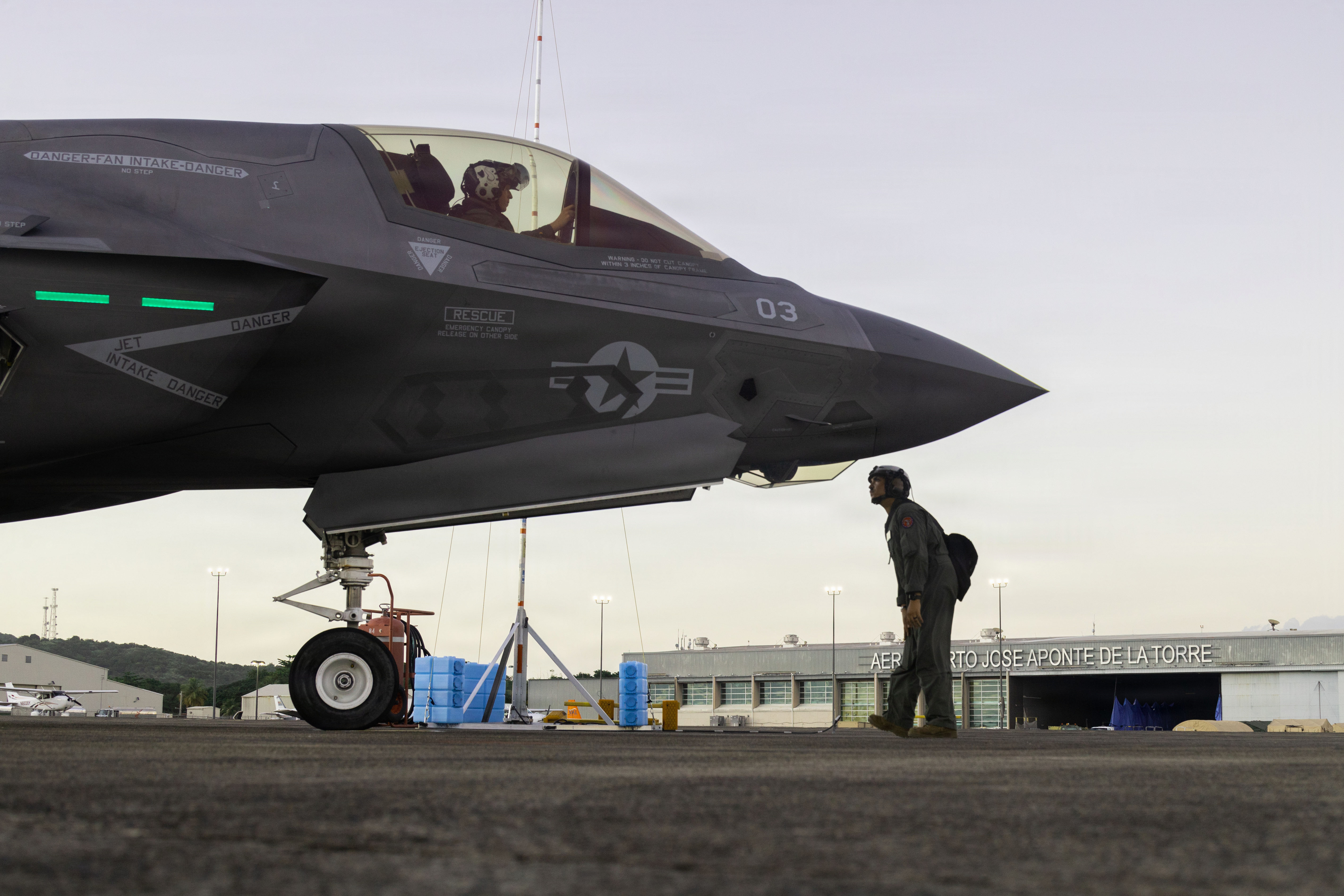 U.S. Marines with Marine Fighter Attack Squadron (VMFA) 225, U.S. Marine Corps Forces South, prepare to shut down a U.S. Marine Corps F-35B Lightning II assigned to VMFA-225 at Jose Aponte de la Torre Airport in Ceiba, Puerto Rico, Oct. 28, 2025. U.S. military forces are deployed to the Caribbean in support of the U.S. Southern Command mission, Department of War-directed operations, and the president’s priorities to disrupt illicit drug trafficking and protect the homeland. (U.S. Marine Corps photo)